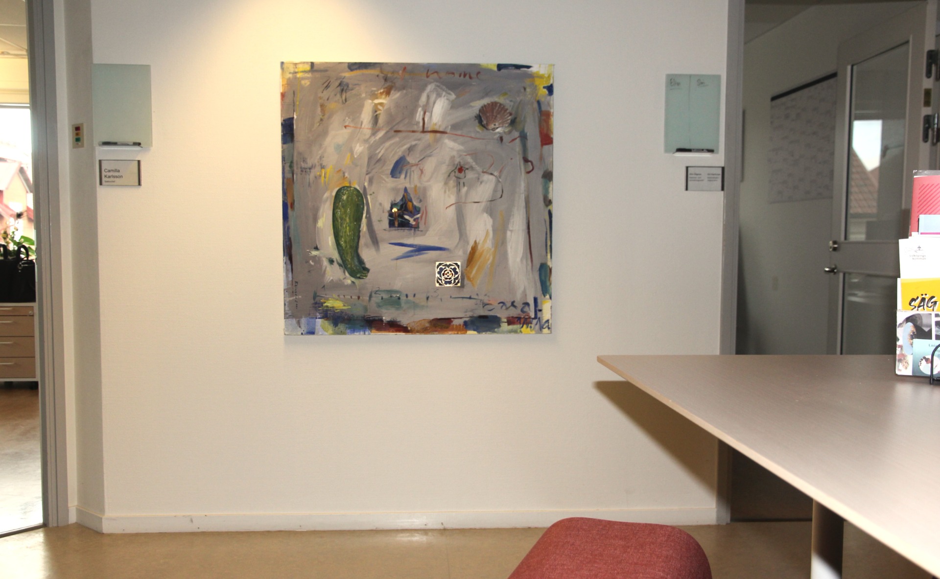Många av mina bilder finns på sjukhus och i regionens offentliga lokaler. Den blålila målningen hänger tillsammans med Sussane Öhlens vackra urnor på Sjukhuset i Lidköping.