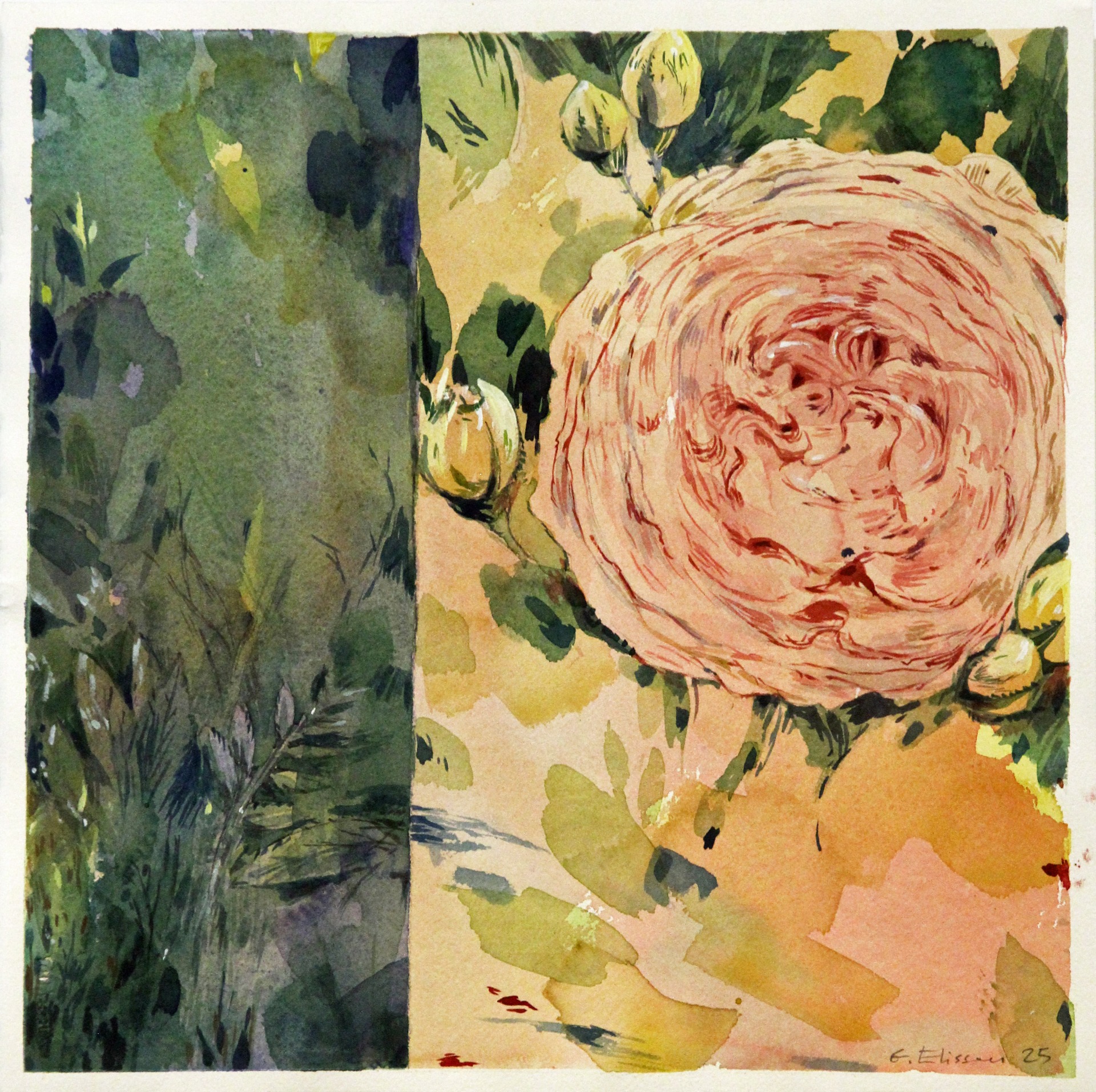 Årets skörd 2025. Akvareller med inslag av gouache. Utsnitt, djupdykningar in i grönskan. Kanske inte porträtt av blommor och växter, mer känslan av att vara där, uppleva och frysa ögonblicket.