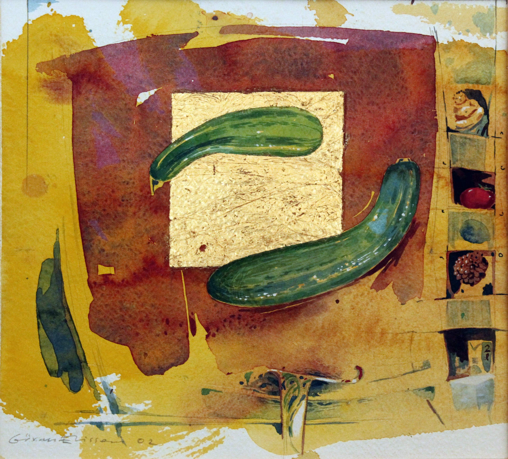 TVÅ FRUKTER Akvarell och bladguld, 2002, 25x 27 cm.