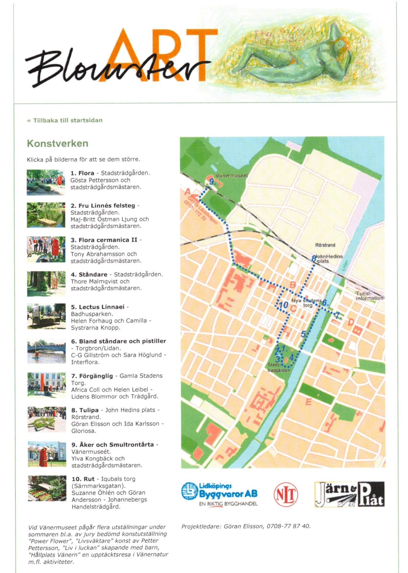 I Konstnärsföreningen LIDAN utvecklades en idé om att vara med och bidra, låta konsten flöda i Lidköpings yttre miljöer och parker. Gösta Pettersson, nestorn i vår förening, gjorde vinjetten och en vacker Flora i Stadsparken.